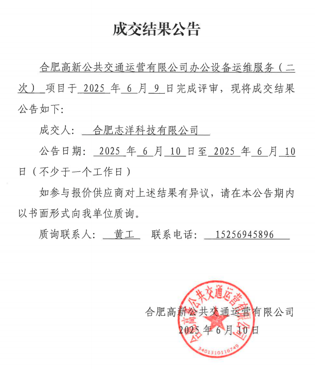 合肥高新公共交通運營(yíng)有限公司辦公設備運維服務(wù)項目(二次)成交結果公告