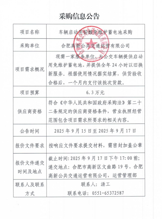 高新公交車(chē)輛啟動(dòng)用鉛酸免維護蓄電池采購信息公告