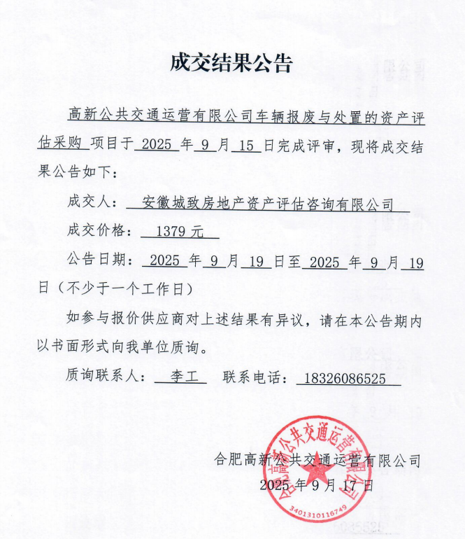 高新公共交通運營(yíng)有限公司車(chē)輛報廢與處置的資產(chǎn)評估成交結果公告